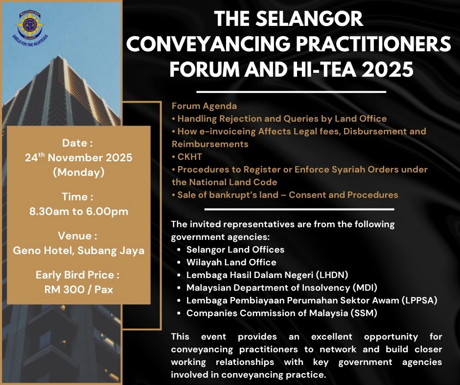 04th November 2025The Selangor Bar Conveyancing Practice Sub-Committee 2025/2026 will be organising an inaugural forum, “The Selangor Conveyancing Practitioners Forum and Hi-Tea 2025” for all conveyancing practitioners to gain insight into conveyancing practice and an opportunity to network with fellow conveyancing practitioners and representatives of the relevant government bodies.