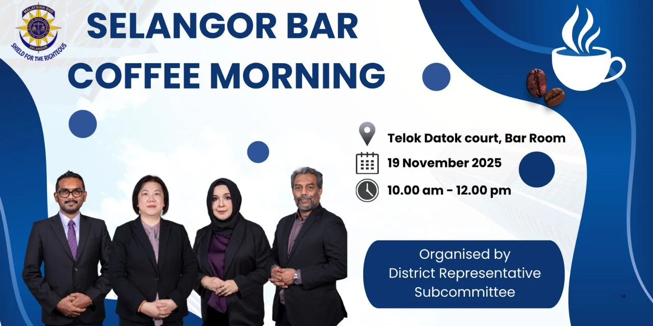 The Selangor Bar District Representative Sub-Committee for 2025/2026 is excited to announce our Selangor Bar Coffee Morning at Telok Datok Court. This event aims to give an opportunity for the Committee to connect and engage with members on any matter involving the courts or legal practice.