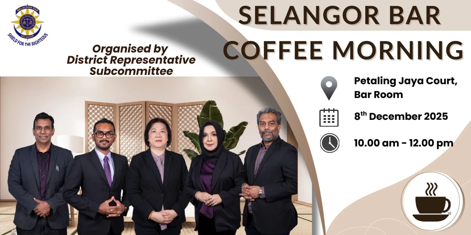 The Selangor Bar District Representative Sub-Committee for 2025/2026 is excited to announce our Selangor Bar Coffee Morning at Petaling Jaya Court. This event aims to give an opportunity for the Committee to connect and engage with members on any matter involving the courts or legal practice.