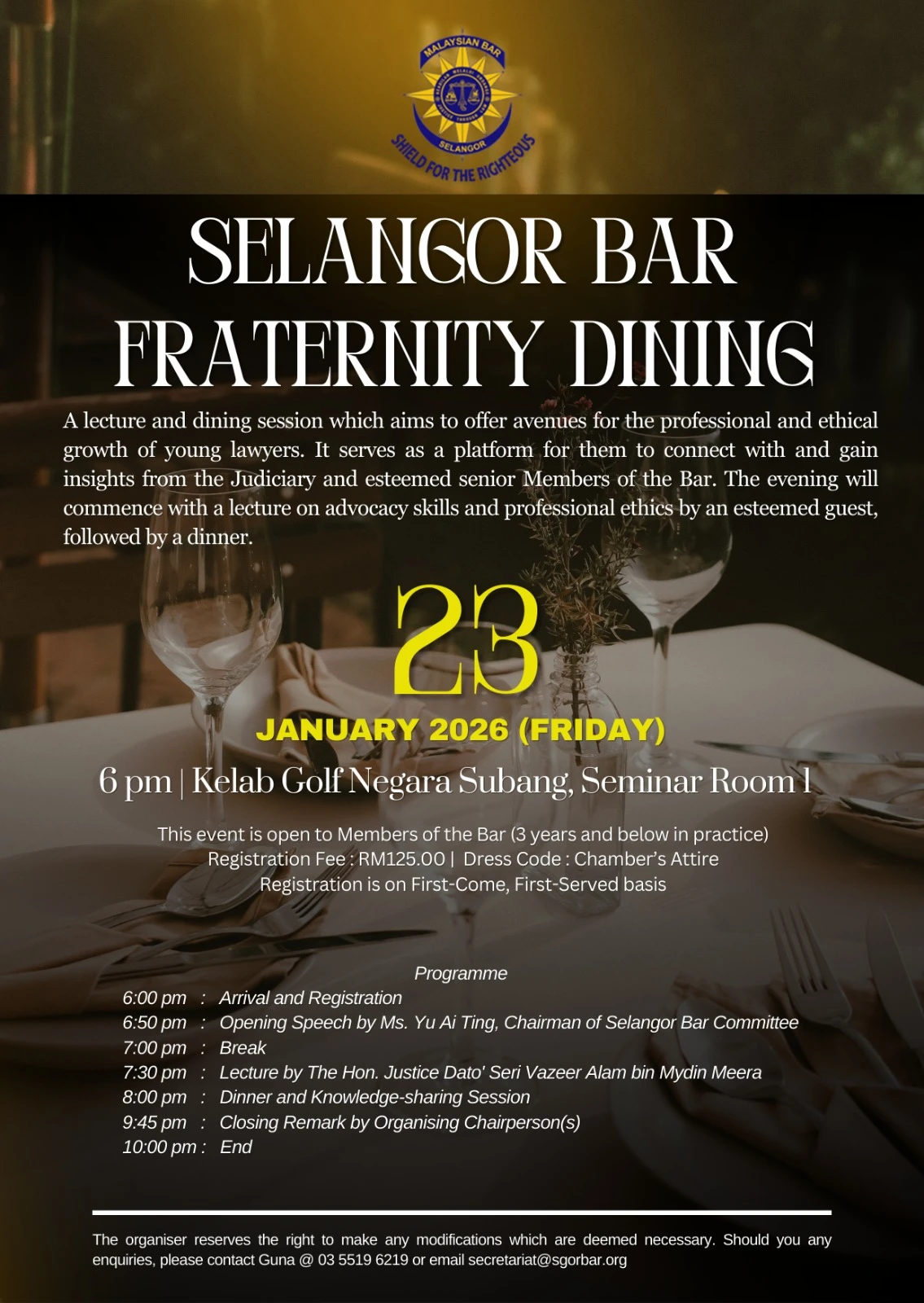 We look forward to your early registration and hope that this meaningful tradition will continue to be upheld, fostering fellowship and professional values within the Selangor Bar.