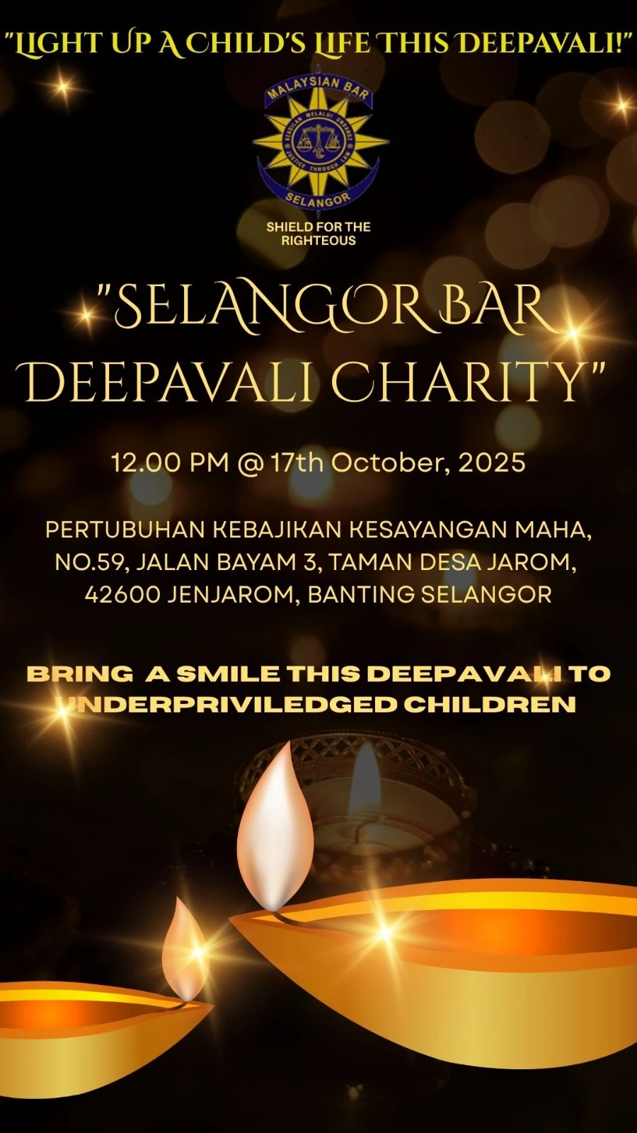 In line with the spirit of Deepavali, the Selangor Bar Committee invites you to join us in making a difference in the lives of underprivileged children through this event. The event aims to provide these children with delicious food and other necessities.